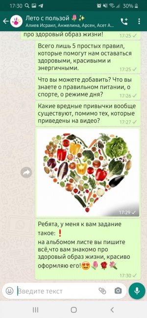 Лето, отдых, но не забываем про здоровый образ жизни. Это тема очередного занятия детской летней площадки. Детям были предложены 5 правил, чтобы быть здоровыми, красивыми и энергичными, поговорили о здоровом питании, спорте, режиме дня. Не забыли и о вредных привычках. В рисунках дети выразили своё отношение к зоровому образу жизни и вредным привычкам.