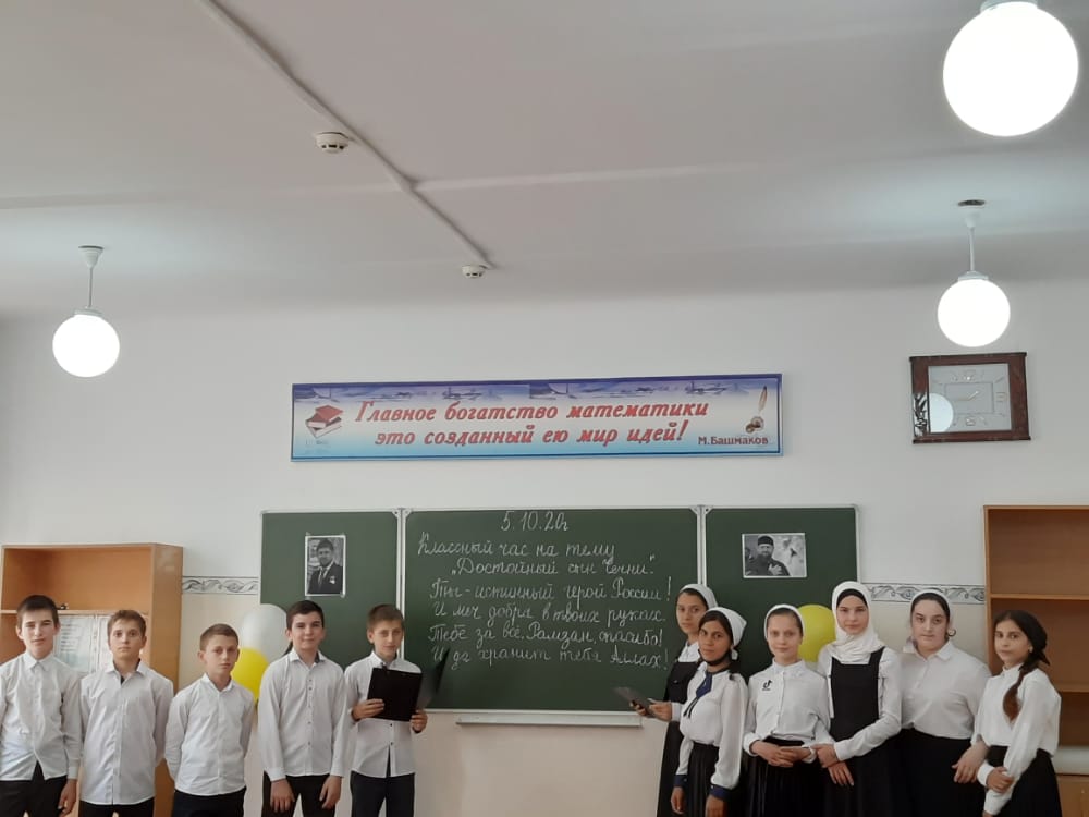 5 октября в рамках чествования Дня рождения Главы Чеченской Республики Кадырова Р.А. в школе прошли праздничные мероприятия. На классных часах " Достойный сын Чечни" обучающиеся школы читали стихи, вспоминали важные этапы жизни нашего лидера. На уроках истории обучающиеся школы вспоминали историю нашей родины и о вкладе в её становление, развитие и процветание Первого Президента ЧР А.-Х.Кадырова и Главы ЧР Р.А.Кадырова.