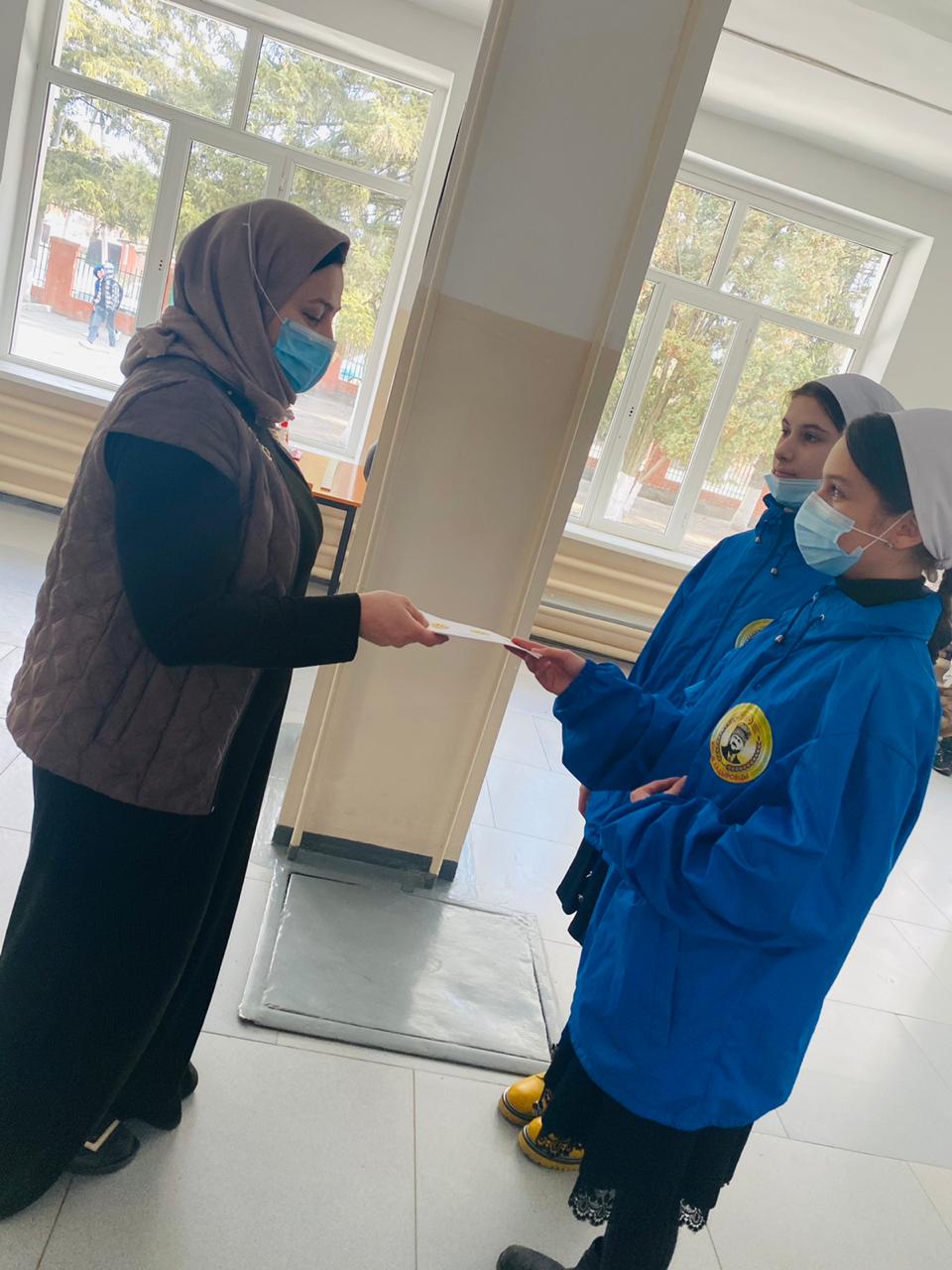 Педагог организатор Абдиева М. Х.совместно с ЕДЮЮ "Юные Кадыровцы" раздали букеты родителям первых классов. " Безопасность детей - забота родителей! "