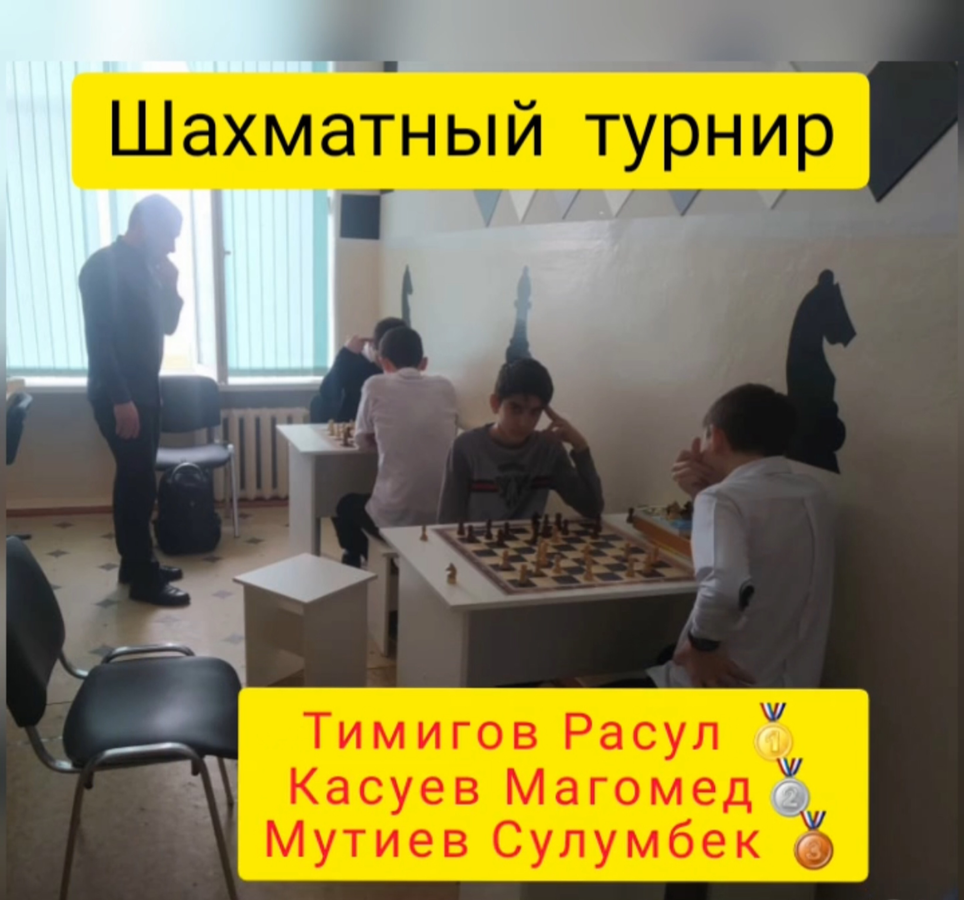 ПОЗДРАВЛЯЕМ ПОБЕДИТЕЛЯ ТИМИГОВА РАСУЛА, а также призеров Касуева Магомеда и Мутиева Сулумбека с пополнением портфолио по итогам школьного турнира по шахматам