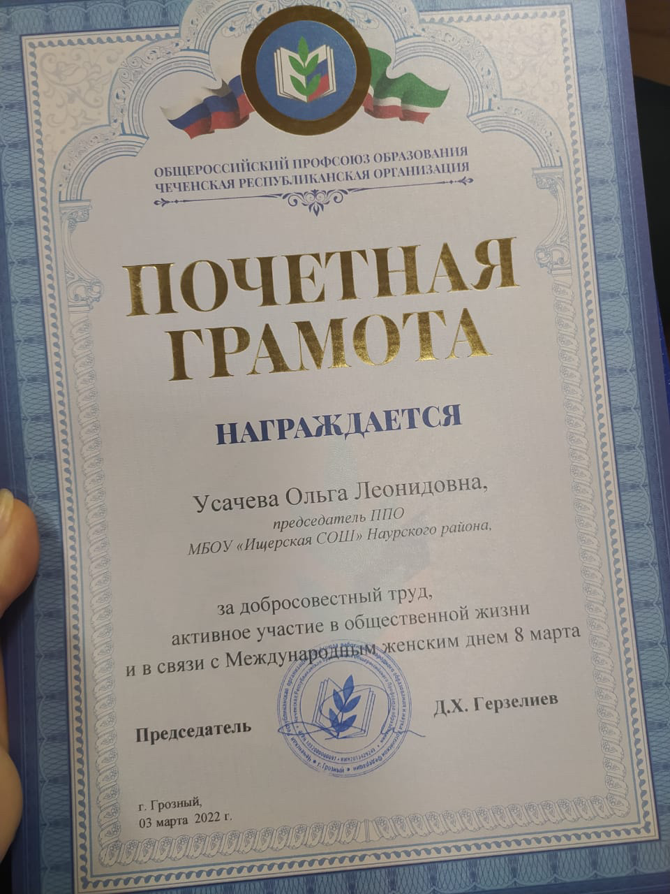 ОБЩЕРОССИЙСКИЙ ПРОФСОЮЗ ОБРАЗОВАНИЯ ЧР наградил УСАЧЕВУ ОЛЬГУ ЛЕОНИДОВНУ, председателя ППО МБОУ «Ищерская СОШ», за добросовестный труд, активное участие в общественной жизни и в связи с Международным женским днём 8 марта! Поздравляем коллегу с заслуженным признанием, желаем здоровья, творческого вдохновения и новых побед🌹🌹🌹